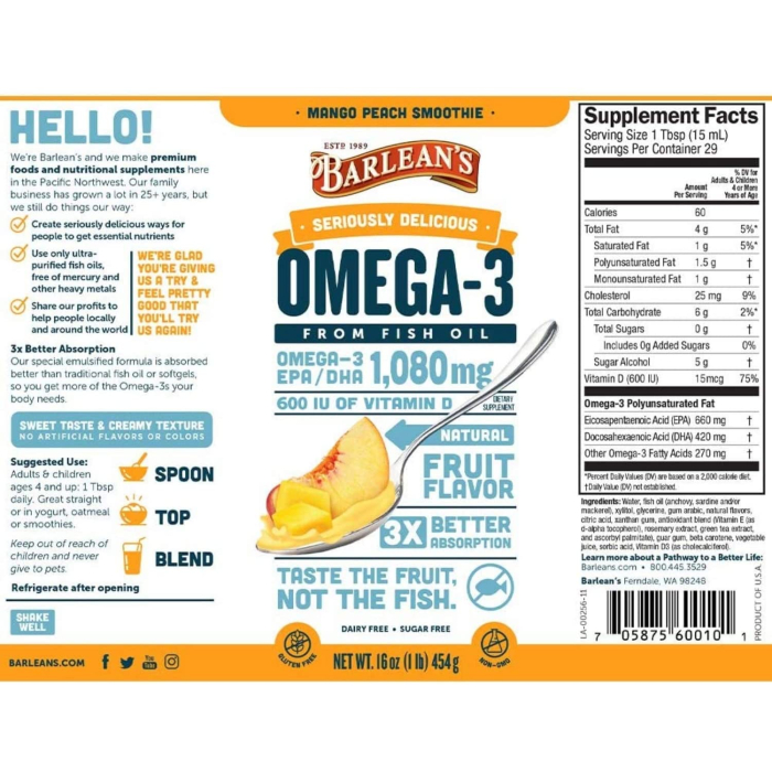 Ingredients: Purified Fish Oil (Salmon Oil and/or Cod Liver Oil), water, xylitol, glycerine, gum arabic, natural flavors, citric acid, xanthan gum, guar gum, beta carotene and vegetable juice (for color), Vitamin E (as d-alpha tocopherol) and ascorbyl palmitate to ensure freshness.