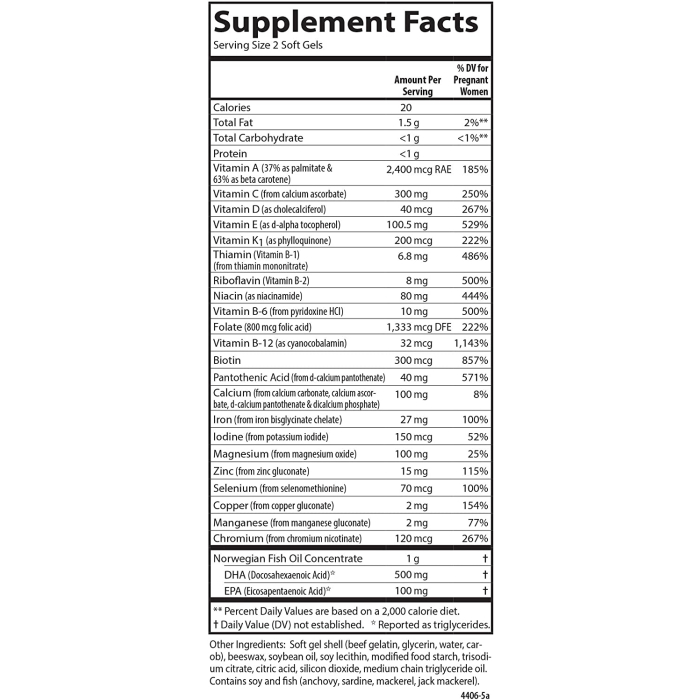 Pregnancy can place high demands on our body. Prenatal provides the important vitamins and minerals that support mom and baby before, during, and after pregnancy. The addition of the important omega-3 DHA promotes a healthy heart and mood for moms and brain and vision health for developing babies. Help support a healthy pregnancy with Carlson Prenatal