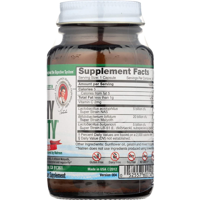 Each of Natren's non-dairy probiotic capsules contains a minimum of 30 billion colony forming units (cfu) of three potent, super strains of beneficial bacteria. Natren's Healthy Trinity uses only bacteria super strains developed through years of research. These bacteria strains have proven to be the most beneficial for specific regions or functions of the gastrointestinal tract.