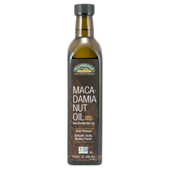 Ellyndale® Naturals premium-grade Macadamia Nut Oil is the perfect oil for your favorite recipes. In addition to its rich, nutty flavor and buttery-smooth texture, macadamia nut oil has a high smoke point (approximately 400° F) and a high heat tolerance, making it an ideal oil for frying. With up to 79% monounsaturated fatty acids and very little polyunsaturated fat, macadamia nut oil is very stable, boasting an unrefrigerated shelf life of up to two years.
