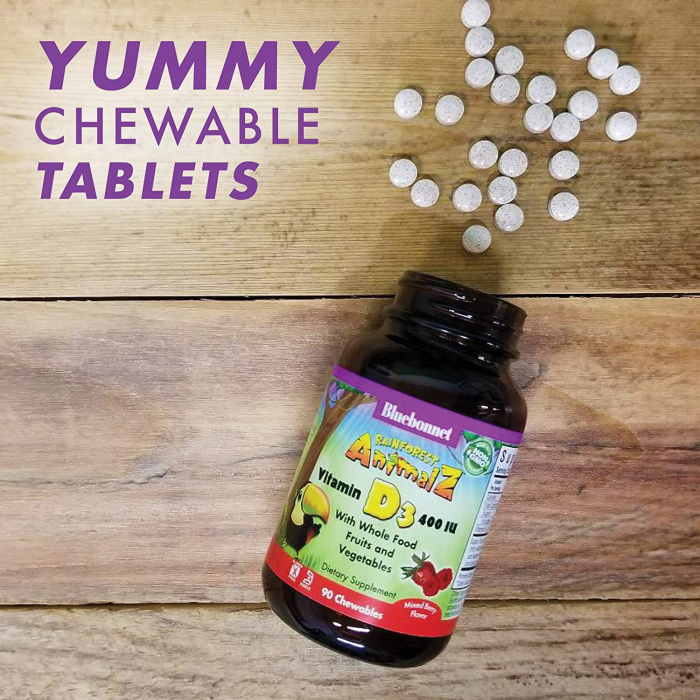 Bluebonnet’s Super Earth® Rainforest Animalz® Vitamin D3 400 IU helps bridge the nutrient gap often found in children’s diets with vitamin D3 (cholecalciferol) in a base of super fruits and vegetables. All this in just one yummy chewable per serving.