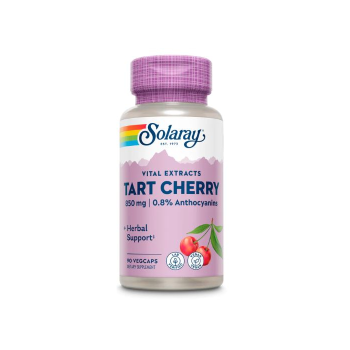 Solaray Tart Cherry Fruit Extract brings you the benefits of tart cherry juice‚ a popular joint health drink, without the sugar. Along with at least 17 antioxidants including quercetin, anthocyanins, and ellagic acid, tart cherries contain an abundance of nutrients as well as trace melatonin. Designed to help support your body's natural cleansing process of uric acid, our Tart Cherry Fruit Extract is guaranteed to contain .8% anthocyanins and may help support healthy joints and muscle recovery as well as normal, healthy sleep cycles.