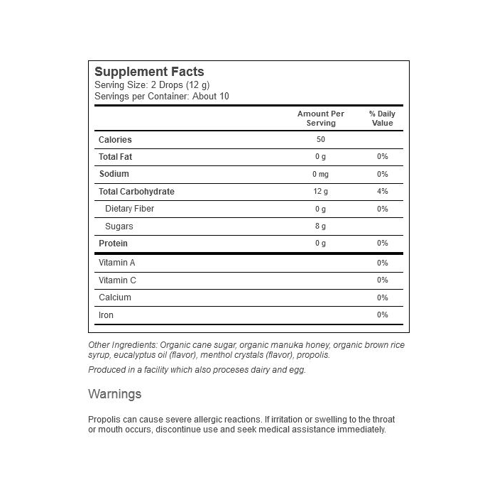 Ingredients: Organic cane sugar, organic manuka honey, organic brown rice syrup, eucalyptus oil (flavor), menthol crystals (flavor), propolis.