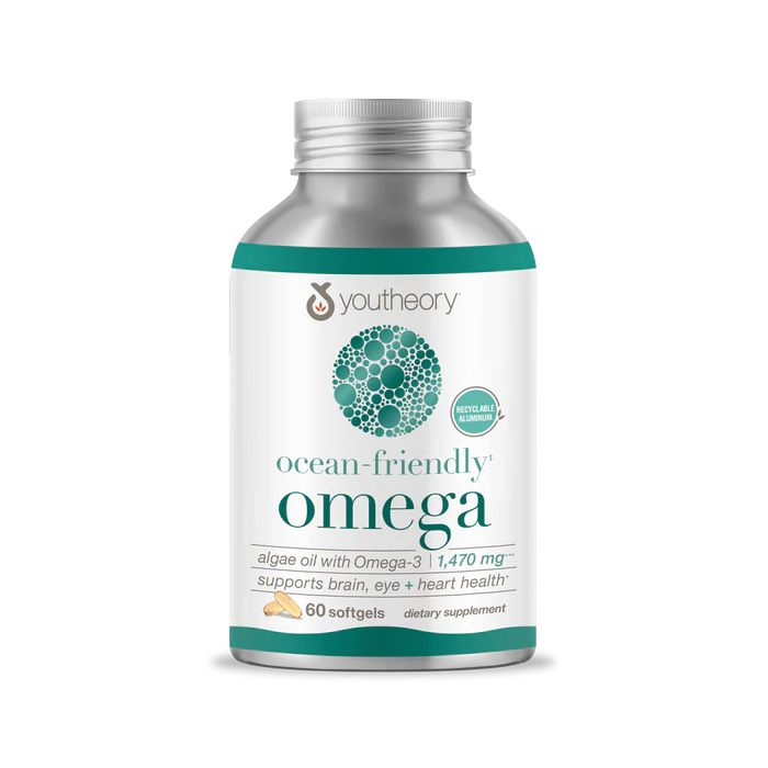 Youtheory® Ocean-Friendly Omega provides the same essential fatty acids as fish oil, but better. Why? Because it’s made from plants, not fish. Derived from algae where fish get their omega-3, Ocean-Friendly Omega is a highly-potent and more sustainable source of EPA and DHA. Plus, no fishy aftertaste!